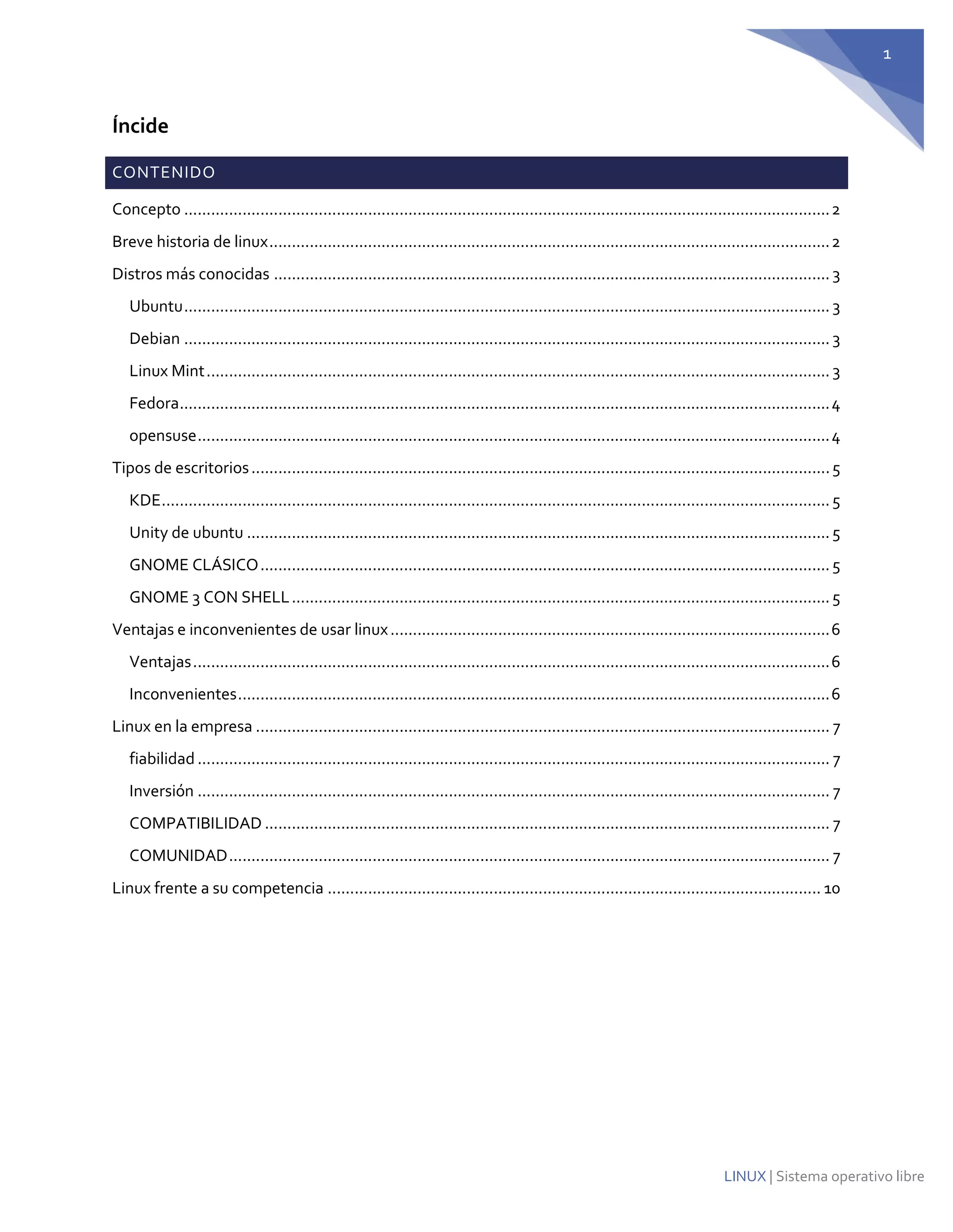 El documento aborda el sistema operativo Linux, destacando su naturaleza de software libre, su historia vinculada al proyecto GNU y las principales distribuciones como Ubuntu, Debian y Linux Mint. También se analizan las ventajas e inconvenientes de utilizar Linux, su aplicación en entornos empresariales, y su competencia con otros sistemas operativos como Windows y Mac OS. Además, menciona la creciente adopción de Linux en diversas instituciones y empresas a nivel global.