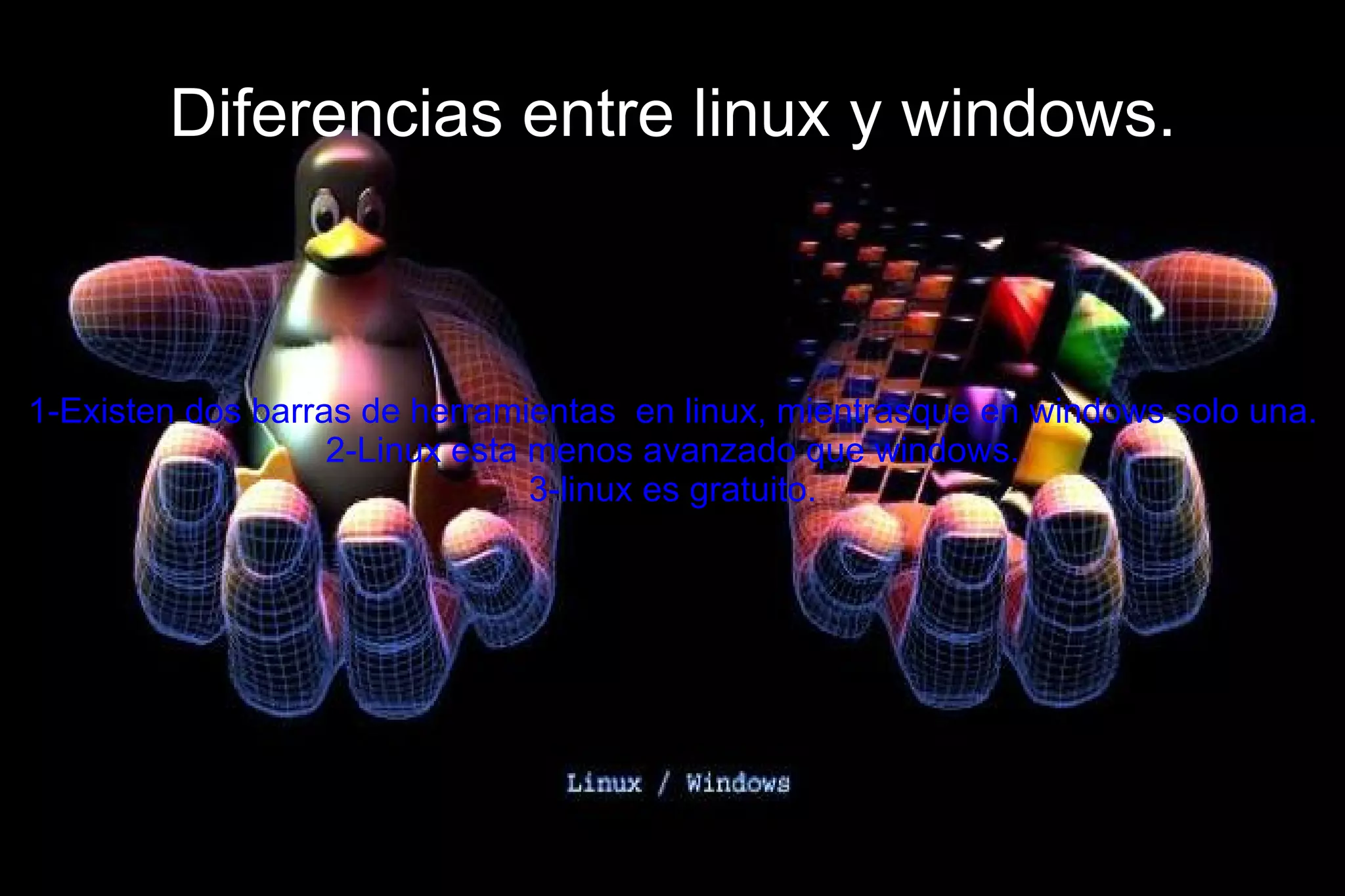El documento compara Linux y Windows, señalando que Linux tiene dos barras de herramientas mientras que Windows solo tiene una, Linux es gratuito mientras que Windows no, y que Linux es menos susceptible a virus. También discute que aunque Linux puede ser más difícil de usar para algunos usuarios debido a su configuración, ofrece mayor personalización y control sobre lo que se instala.