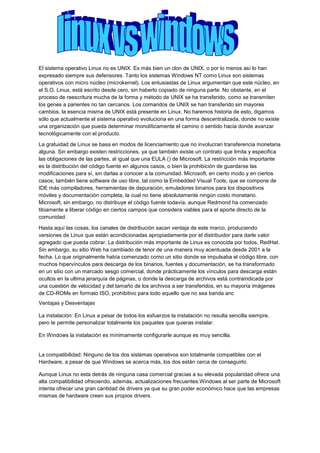 Linux no es técnicamente UNIX, pero es un clon de UNIX. Al igual que Windows NT, Linux es un sistema operativo de microkernel, aunque su núcleo fue escrito de cero sin copiar código de otros sistemas. Linux evoluciona de forma descentralizada sin una organización que determine su dirección, mientras que los comandos y esencia de UNIX permanecen presentes. La gratuidad de Linux se basa en licencias libres que no involucran pagos pero restringen la distribución del código fuente en algunos casos.