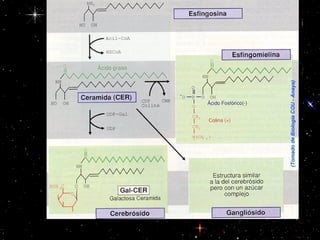 El documento describe los diferentes tipos de lípidos, incluyendo ácidos grasos, acilglicéridos, lípidos complejos como fosfolípidos y esfingolípidos, ceras, esteroides y terpenos. Los lípidos son compuestos orgánicos formados principalmente por carbono, hidrógeno y oxígeno que cumplen funciones estructurales y de almacenamiento de energía en los seres vivos.