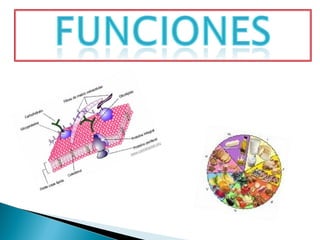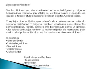 Las lípidos son moléculas orgánicas compuestas principalmente de carbono e hidrógeno que cumplen funciones estructurales, de reserva energética y reguladoras en los organismos. Desempeñan cuatro funciones principales: reserva energética, formación de bicapas lipídicas de las membranas, facilitación de reacciones bioquímicas y transporte de lípidos. Las grasas son fuente de ácidos grasos esenciales y juegan un papel vital en la salud de la piel, cabello