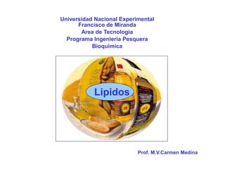 Este documento describe los diferentes tipos de lípidos, incluyendo ácidos grasos, triglicéridos, fosfolípidos, ceras y otros. Explica sus propiedades químicas, funciones biológicas como combustible de reserva y componentes estructurales de membranas, y su papel en procesos como la saponificación. También resume la clasificación, composición y degradación de los lípidos en el pescado.