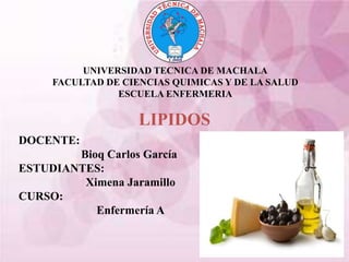 Este documento describe los lípidos, incluyendo sus funciones, clasificación y tipos principales. Los lípidos desempeñan funciones de reserva energética, estructural, biocatalizadora y transportadora. Se clasifican en saponificables e insaponificables. Los lípidos saponificables incluyen acilglicéridos, fosfolípidos y glucolípidos. Los insaponificables son terpenos, esteroides y prostaglandinas. Los ácidos grasos son moléculas formadas por cadenas hidrocarbonadas con
