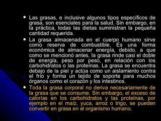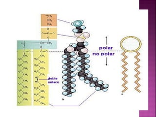 Los lípidos son un conjunto de moléculas orgánicas compuestas principalmente por carbono e hidrógeno que cumplen funciones diversas como reserva energética, estructural, biocatalizadora y transportadora. Son hidrófobas e insolubles en agua pero solubles en disolventes orgánicos. Se clasifican en lípidos saponificables como acilglicéridos y fosfolípidos, e insaponificables como terpenoides y esteroides. Debido a su insolubilidad en agua, los lípidos corporales su