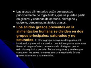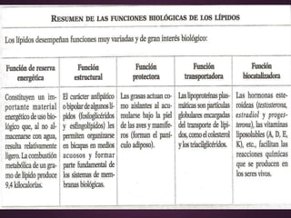 Los lípidos son un conjunto de moléculas orgánicas compuestas principalmente por carbono e hidrógeno, aunque también pueden contener oxígeno, fósforo, azufre y nitrógeno. Cumplen funciones estructurales, de reserva energética, biocatalizadoras y transportadoras en los organismos vivientes. Son hidrófobas e insolubles en agua pero solubles en disolventes orgánicos. Se clasifican en lípidos saponificables como los acilglicéridos y lípidos insaponificables