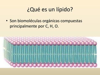 Los lípidos se clasifican en saponificables e insaponificables. Los saponificables incluyen ácidos grasos, ceras, grasas, fosfolípidos y esfingolípidos. Los fosfolípidos son importantes componentes de las membranas celulares. Los insaponificables incluyen terpenos, esteroles, esteroides y vitaminas como la D y K.