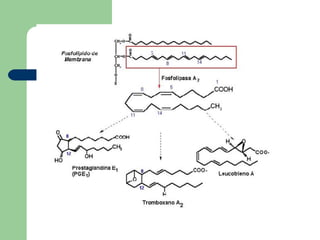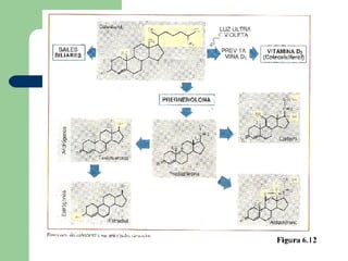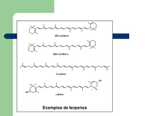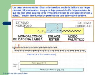 El documento describe diferentes tipos de biomoléculas orgánicas como lípidos, incluyendo ceras, fosfolípidos, terpenos, esteroides y glicolípidos. También explica la estructura química de los fosfolípidos y del colesterol, así como las diferentes partes de una molécula de fosfolípido.