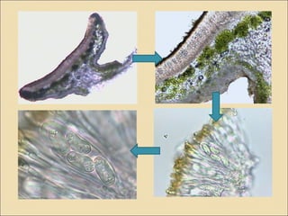 Los líquenes son organismos simbiontes formados por hongos y algas u otros organismos fotosintéticos. Existen varios tipos de líquenes como crustáceos, foliáceos y fruticulosos que se reproducen formando estructuras llamadas apotecios. Algunos ejemplos comunes son Lecanora muralis, Evernia punastri, Cladonia rangiferina y Usnea barbata.