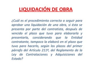 El resumen trata sobre el procedimiento a seguir para aprobar una liquidación de obra presentada fuera de plazo por el contratista o la entidad contratante. Se establece que cualquiera de las partes puede presentar la liquidación de forma extemporánea, activándose entonces el procedimiento establecido en el reglamento. El arbitraje sólo puede solicitarse antes del consentimiento de la liquidación, resolviéndose las controversias posteriores en la vía judicial. Una liquidación no observada en plazo queda consentida para efectos legales, pudiendo dirimir las