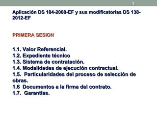 El documento habla sobre la liquidación de obras públicas y cubre temas como el valor referencial, el expediente técnico, los sistemas y modalidades de contratación, las particularidades del proceso de selección, los documentos requeridos para la firma del contrato y las garantías. Explica que el valor referencial debe incluir todos los costos del proyecto y que el expediente técnico contiene la memoria descriptiva, planos, especificaciones, presupuesto y estudios complementarios. También describe los diferentes sistemas y modalidades de contratación de obras públic