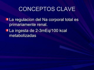 El documento describe los conceptos clave de los líquidos y electrolitos en el cuerpo. Explica que la regulación del sodio corporal total es principalmente renal y que la ingesta normal de líquidos es de 2-3 mEq/100 kcal metabolizadas. También define términos como milimol, miliequivalente y osmolaridad y describe la distribución del agua y electrolitos como sodio y potasio en los diferentes compartimientos corporales así como los mecanismos de regulación.