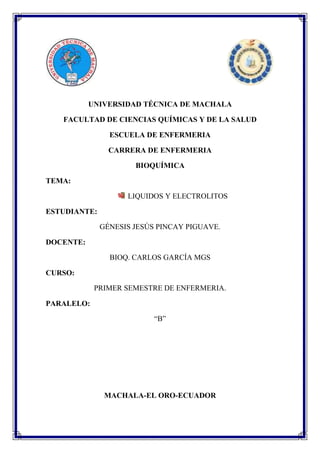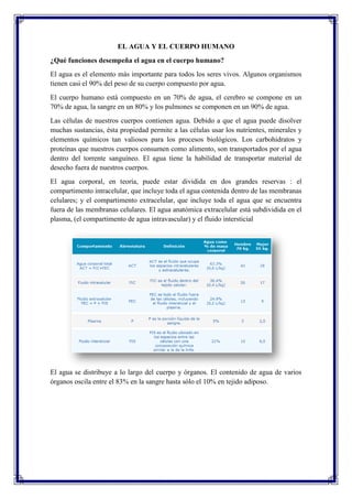 El documento resume la importancia del agua y los electrolitos en el cuerpo humano. El agua constituye alrededor del 70% del peso corporal y desempeña funciones vitales como transportar nutrientes y desechos, regular la temperatura y participar en reacciones metabólicas. La cantidad mínima de agua necesaria diariamente es de aproximadamente 2 litros. Los electrolitos como el sodio, potasio y calcio son esenciales para el funcionamiento celular y el mantenimiento del equilibrio hídrico, y niveles anormales