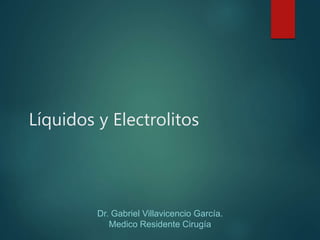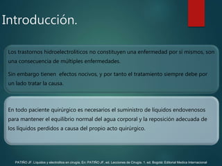 Este documento resume los conceptos básicos sobre líquidos y electrolitos. Explica que los trastornos hidroelectrolíticos son consecuencia de múltiples enfermedades y que su tratamiento debe abordar tanto la causa como los síntomas. También destaca la importancia de mantener el equilibrio hídrico en pacientes quirúrgicos mediante el suministro de líquidos endovenosos. Finalmente, describe las alteraciones más comunes de los electrolitos como el sodio, potasio y calcio, incluyendo sus causas,