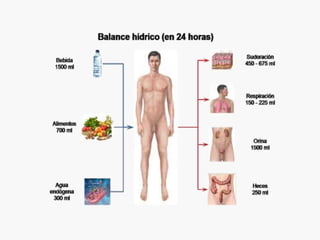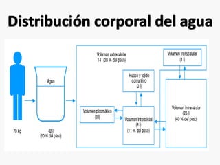 Este documento resume los principales electrolitos y trastornos relacionados. Describe los cationes y aniones que componen el líquido extracelular (LEC) y líquido intracelular (LIC), así como la osmolaridad y sus cálculos. Explica los trastornos del volumen, concentración y composición, centrándose en sodio, potasio, cloro, magnesio y calcio. Detalla las causas, síntomas y tratamiento de la hipo e hiper de cada electrolito.