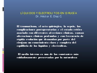 Este documento describe los líquidos y electrolitos corporales y sus alteraciones en el contexto de la cirugía. Explica la anatomía y distribución de los líquidos corporales, la composición de los diferentes compartimentos líquidos, y los mecanismos de regulación del volumen y la osmolalidad. También clasifica las alteraciones de los líquidos y electrolitos, describe las causas y síntomas de la depleción de volumen, y ofrece recomendaciones para la evaluación de pacientes hipovoleméticos.
