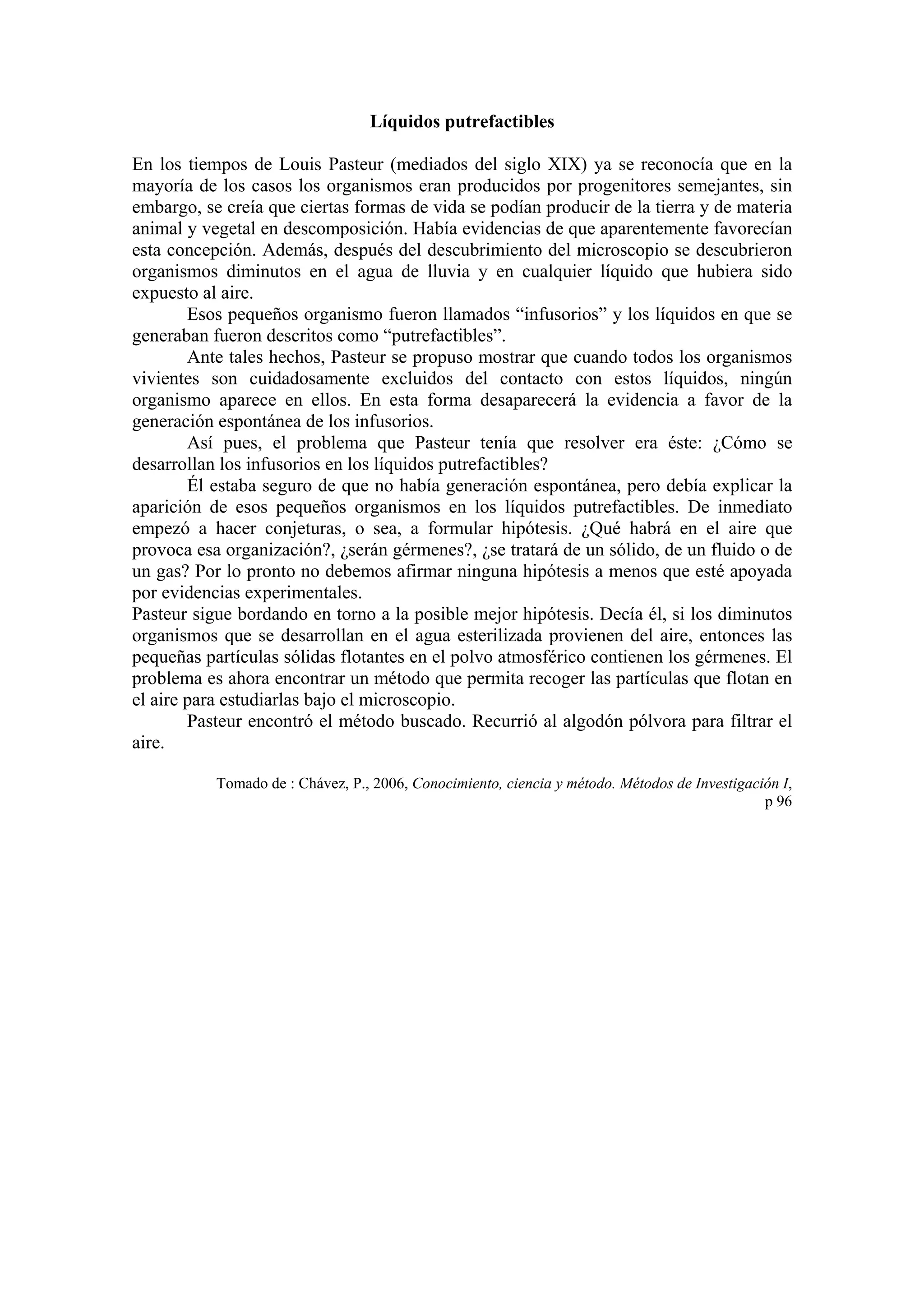 El documento describe cómo Louis Pasteur buscó demostrar que los organismos no se generaban espontáneamente en líquidos en descomposición, sino que se introducían a través del aire. Pasteur formuló la hipótesis de que pequeñas partículas en el polvo del aire contenían los gérmenes que causaban la aparición de organismos en los líquidos. Para probar esta teoría, desarrolló un método para filtrar el aire y recolectar las partículas para su examen microscópico.