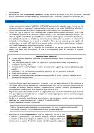 Este documento describe una sesión de aprendizaje de matemáticas para primer grado, centrada en la resolución de problemas aditivos mediante un juego llamado 'la banda de música'. Se proporcionan materiales, estrategias y un enfoque estructurado que involucra a los estudiantes en la simulación de situaciones de cambio, donde deben aumentar y disminuir cantidades. Al final de la sesión, se reflexiona sobre los procesos de aprendizaje y se promueve la transferencia de conocimientos a nuevas situaciones.