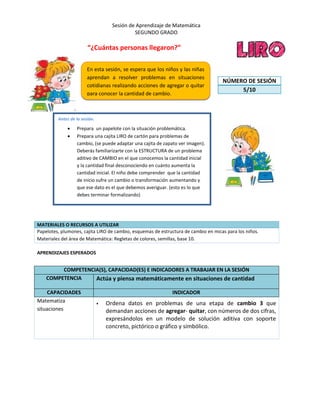 La sesión de aprendizaje de matemáticas para segundo grado se centra en resolver problemas aditivos de cambio, donde los alumnos deben aprender a averiguar cuánto aumenta o disminuye una cantidad inicial. Utilizando materiales concretos como la cajita liro de cambio, los estudiantes trabajan en situaciones cotidianas para entender y resolver dichos problemas. La sesión incluye actividades interactivas para fomentar la participación y el diálogo sobre el proceso de resolver problemas matemáticos.