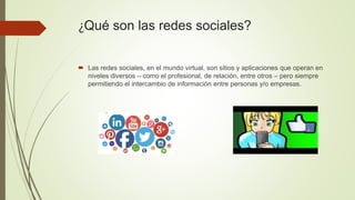Este documento describe las redes sociales, sus usos y ventajas y desventajas. Define las redes sociales como sitios y aplicaciones que permiten el intercambio de información entre personas y empresas. Explica que las más populares son Facebook, YouTube, WhatsApp, Facebook Messenger e Instagram. Sus principales ventajas son la comunicación, oportunidades laborales e información y entretenimiento, mientras que las desventajas incluyen estafas, privacidad y cumplimiento de normas.