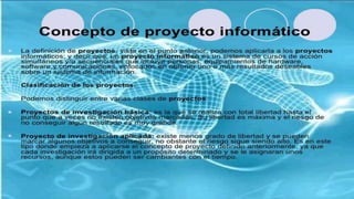 Este documento describe la informática y los objetivos y tipos de proyectos informáticos. La informática es la ciencia del tratamiento automático de la información mediante computadoras. Existen tres tipos de objetivos para proyectos informáticos: de servicio, de producción y estratégicos. También hay diferentes tipos de proyectos según el riesgo y libertad, como proyectos de investigación básica, aplicada y de investigación y desarrollo. El proyecto informático debe entenderse como una decisión estratégica de la empresa para