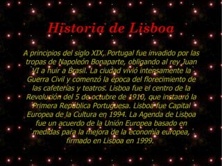 Lisboa es la capital y ciudad más grande de Portugal. Se encuentra en el río Tajo y tiene una población de aproximadamente 545,245 habitantes. Algunos de los principales monumentos de Lisboa incluyen el Castillo de San Jorge, la Torre de Belém, el Parque de las Naciones y el Monasterio de los Jerónimos.