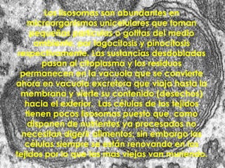 Los lisosomas son abundantes en microorganismos unicelulares que toman partículas del medio ambiente por fagocitosis y pinocitosis, digiriendo las sustancias en la vacuola que luego se convierte en una vacuola excretora para expulsar los residuos hacia el exterior, mientras que las células de los tejidos tienen menos lisosomas ya que reciben nutrientes procesados y solo renuevan células viejas que mueren.