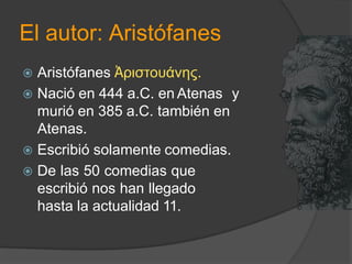 Aristófanes nació en el 444 a.C. en Atenas y escribió exclusivamente comedias, de las cuales 11 han sobrevivido. La obra Lisístrata, escrita en el 411 a.C., muestra a las mujeres de Grecia cansadas de la guerra y proponiendo una huelga de sexo para forzar la paz. Lisístrata persuade a las mujeres a jurar no tener relaciones con sus maridos hasta que se firme un tratado de paz, logrando así que los hombres negocien el fin de la guerra.