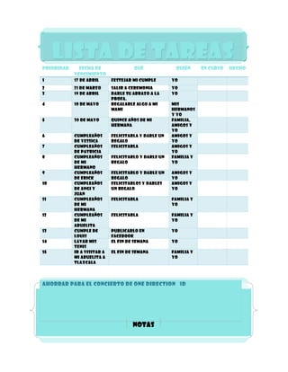 La lista incluye 15 tareas pendientes de una persona para ahorrar dinero para un concierto de One Direction, incluyendo celebrar cumpleaños de familiares y amigos, dar regalos y abrazos, lavar tenis, y visitar a la abuelita.