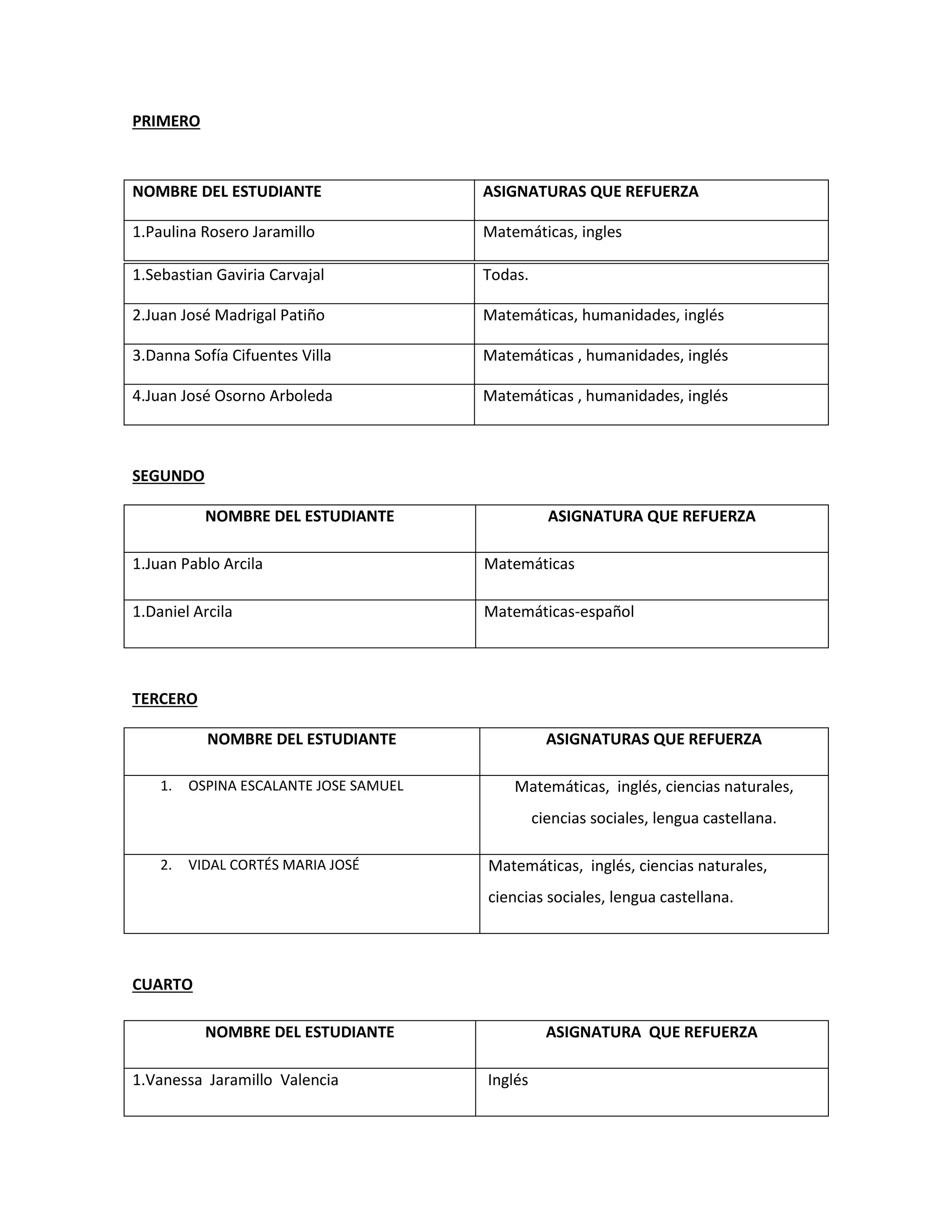 El documento lista los nombres de estudiantes y las asignaturas que cada uno refuerza en diferentes grados. La mayoría de estudiantes refuerza matemáticas, geometría, ciencias naturales, sociales, lengua castellana e inglés. Algunos también refuerzan otras asignaturas como física, química, tecnología, ética y filosofía.