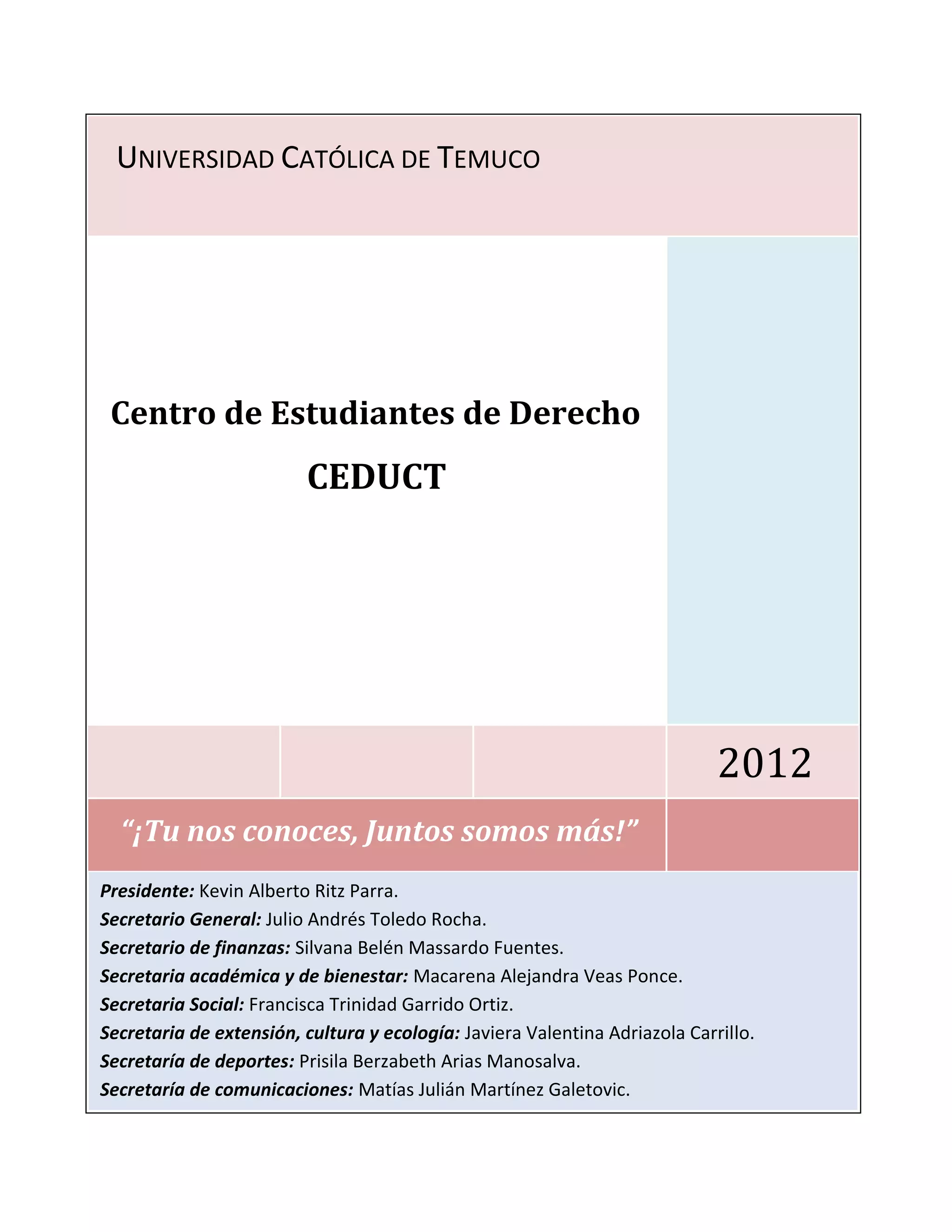Este documento presenta la propuesta del Centro de Estudiantes de Derecho de la Universidad Católica de Temuco para el año 2012. Detalla la estructura organizativa del centro, sus objetivos principales como consolidar la carrera a nivel comunal y mejorar la comunicación, y sus planes de trabajo en áreas como bienestar estudiantil, actividades sociales, deportes y extensión. El centro busca fortalecer la participación estudiantil y mejorar la experiencia académica a través de diversos proyectos y campañas.