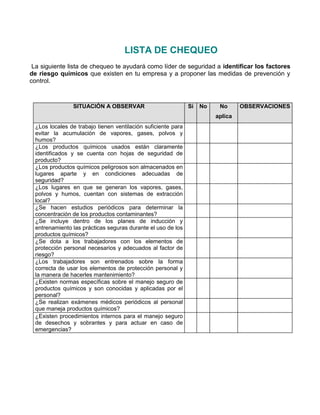 Este documento presenta una lista de chequeo para identificar factores de riesgo químicos en una empresa y proponer medidas de prevención y control. La lista incluye 11 puntos para observar situaciones como la ventilación, identificación y almacenamiento de productos químicos, extracción de vapores, monitoreo de concentraciones contaminantes, entrenamiento en prácticas seguras, uso de equipo de protección personal, normas de manejo, exámenes médicos y procedimientos de emergencia.
