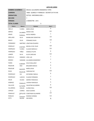 Este documento presenta los resultados de un examen de la asignatura de Microbiología. Incluye los nombres y apellidos de los estudiantes, sus notas en el examen y la asignatura, sección, período y año en que se tomó el examen.