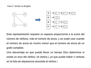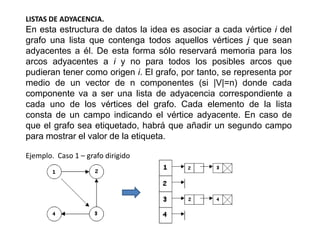 La representación de listas de adyacencia almacena para cada vértice una lista de los vértices adyacentes, ahorrando espacio al no almacenar todos los posibles arcos. Esto requiere espacio proporcional a vértices más arcos. Permitir determinar adyacencia en O(n) pero no permite cambiar el número de vértices. Una lista de listas permite añadir/eliminar vértices modificando la estructura.