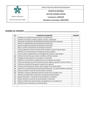 Este documento presenta una lista de chequeo de 16 competencias y evidencias de desempeño para evaluar las habilidades de un aprendiz en el uso de Access. La lista incluye items como identificar conceptos básicos de bases de datos, crear tablas, establecer relaciones, realizar consultas, crear formularios e informes, y conectar una base de datos a una aplicación en Visual Basic.