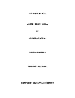 Este documento contiene 4 listas de chequeo para realizar el mantenimiento de diferentes elementos de computo e identificar riesgos potenciales. Cada lista detalla los elementos requeridos, las condiciones de seguridad y los riesgos identificados para desarmar y armar una computadora de escritorio, una laptop, un monitor y una fuente de poder. Los riesgos incluyen cortocircuitos, inflamaciones, virus y accidentes con herramientas. El mantenimiento será realizado por Estiven Cañas Cortes siguiendo los protocolos de seguridad indicados