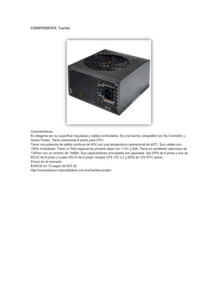 El documento presenta una lista de componentes y sus características para construir una computadora, incluyendo la fuente de poder, cooler, procesador, placa base, memoria RAM, discos duro y SSD, tarjeta gráfica, lector Blu-ray, teclado, mouse, caja y sistema operativo. Se proporcionan los nombres, características principales y precios de cada componente, con un costo total aproximado de $15,693.36 para la computadora completa.