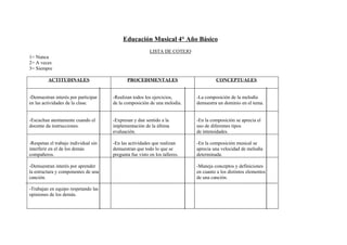 Este documento presenta una lista de cotejo para evaluar a estudiantes de 4to año básico en educación musical. La lista contiene tres secciones: actitudinales, procedimentales y conceptuales. Cada sección evalúa diferentes aspectos relacionados con la participación, atención, respeto, trabajo en equipo y dominio de conceptos musicales de los estudiantes. La lista provee una escala de puntajes ideales y los puntajes obtenidos por los estudiantes en cada sección.