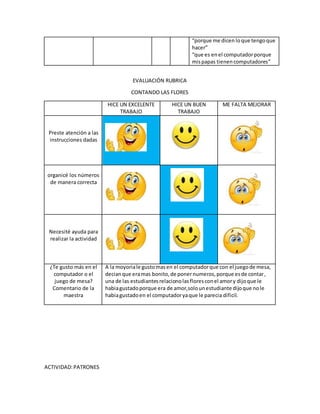 Este documento presenta los resultados de una evaluación de conceptos básicos realizada a estudiantes. Según la lista de cotejo, a los estudiantes les cuesta identificar conceptos como derecha e izquierda, ancho y estrecho. Reconocen otros como más, menos, dentro y fuera. En general, les gustaron las actividades del computador por los gráficos y porque les dicen qué hacer. En la actividad de patrones tuvieron dificultades para observar secuencias de colores.