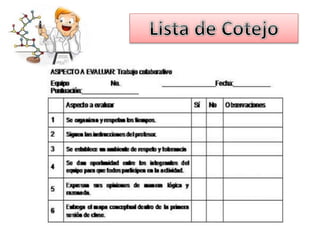 La lista de cotejo es un instrumento de evaluación que consiste en una lista de aspectos observables relacionados con los objetivos de aprendizaje. Se utiliza para verificar de manera sistemática si un estudiante demuestra o no determinadas habilidades, comportamientos o conocimientos mediante la asignación de un valor dicotómico de sí o no. El documento presenta ejemplos de listas de cotejo y sus usos, características y pasos para su elaboración.