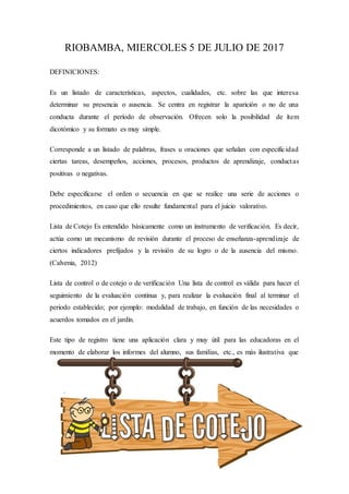 RIOBAMBA, MIERCOLES 5DE JULIO DE 2017 DEFINICIONES: Es un listado de características, aspectos, cualidades, etc. sobre las que interesa determinar su presencia o ausencia. Se centra en registrar la aparición o no de una conducta durante el período de observación. Ofrecen solo la posibilidad de ítem dicotómico y su formato es muy simple. Corresponde a un listado de palabras, frases u oraciones que señalan con especificidad ciertas tareas, desempeños, acciones, procesos, productos de aprendizaje, conductas positivas o negativas. Debe especificarse el orden o secuencia en que se realice una serie de acciones o procedimientos, en caso que ello resulte fundamental para el juicio valorativo. Lista de Cotejo Es entendido básicamente como un instrumento de verificación. Es decir, actúa como un mecanismo de revisión durante el proceso de enseñanza-aprendizaje de ciertos indicadores prefijados y la revisión de su logro o de la ausencia del mismo. (Calvenia, 2012) Lista de control o de cotejo o de verificación Una lista de control es válida para hacer el seguimiento de la evaluación continua y, para realizar la evaluación final al terminar el periodo establecido; por ejemplo: modalidad de trabajo, en función de las necesidades o acuerdos tomados en el jardín. Este tipo de registro tiene una aplicación clara y muy útil para las educadoras en el momento de elaborar los informes del alumno, sus familias, etc., es más ilustrativa que