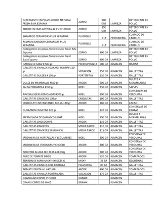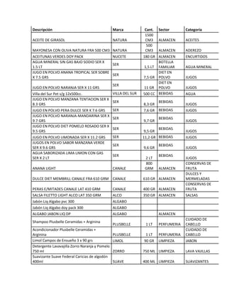 Este documento proporciona una lista de más de 100 productos de almacén con su descripción, marca, cantidad y sector/categoría. La lista incluye artículos de alimentación como aceites, aderezos, galletas y conservas, así como artículos de limpieza, perfumería, café, bebidas y más.