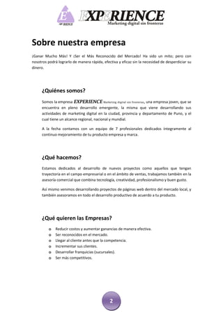 La empresa Experience Marketing Digital ofrece servicios de marketing digital y desarrollo de páginas web para empresas de diferentes tamaños. Presenta diferentes planes de servicios con precios variados según el tamaño de la empresa y los servicios incluidos. Su objetivo es ayudar a las empresas a aumentar sus ventas y posicionarse en el mercado de manera efectiva a través de estrategias de marketing digital.