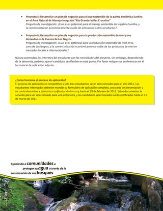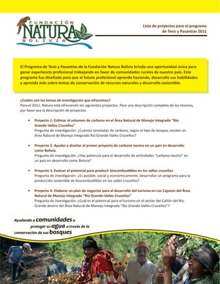 El documento presenta seis proyectos de investigación para estudiantes de tesis y pasantías en 2011 con la Fundación Natura Bolivia. Los proyectos incluyen estimar el volumen de carbono en un área protegida, ayudar a diseñar el primer proyecto de carbono neutro en Bolivia, evaluar el potencial de biocombustibles, desarrollar un plan de turismo para un área protegida, y desarrollar un plan de negocios para el uso sostenible de una palma endémica. El proceso de aplicación es competitivo y solo