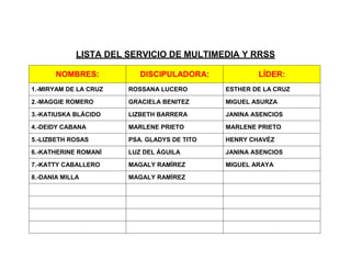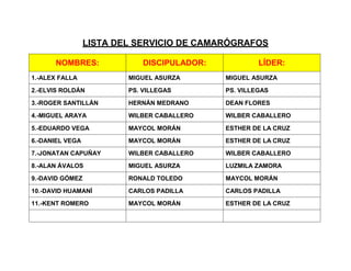 Este documento presenta dos listas, una del servicio de camarógrafos y otra del servicio de multimedia y redes sociales de una organización. La primera lista incluye 11 nombres de camarógrafos asignados a 3 disciplinadores y líderes. La segunda lista tiene 8 nombres de personas del equipo de multimedia asignadas a 4 disciplinadoras y líderes.