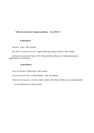 Este documento lista los libros de lectura recomendados para cada curso de lengua castellana en el año escolar 2011/12. Incluye libros de ficción, poesía y obras de teatro para cursos de 1o a 4o de ESO, 1o y 2o de bachillerato. Los libros varían en género y autor para cada nivel, con el objetivo de exponer a los estudiantes a diferentes tipos de literatura.
