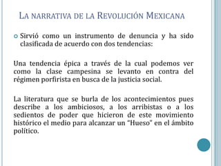 Este documento resume la narrativa de la Revolución Mexicana y algunos de sus autores más importantes. Se divide en dos tendencias: una épica que muestra el levantamiento campesino contra el régimen porfirista, y otra que se burla de los ambiciosos que aprovecharon el movimiento para ganar poder. También analiza las obras de Mariano Azuela como Los de Abajo, y de Martín Luis Guzmán, destacando sus experiencias y obras sobre la Revolución como La querella en México y La sombra del caudillo.
