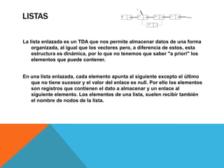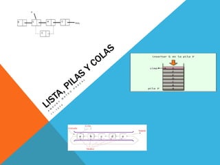 La lista enlazada es una estructura dinámica que almacena datos de forma organizada. Cada elemento apunta al siguiente y contiene un dato y un enlace, excepto el último elemento cuya enlace es null. Las pilas y colas son estructuras que simplifican ciertas operaciones y pueden implementarse con listas enlazadas. Las pilas usan LIFO mediante inserción y extracción desde el principio, mientras que las colas usan FIFO insertando al final y extrayendo del principio.