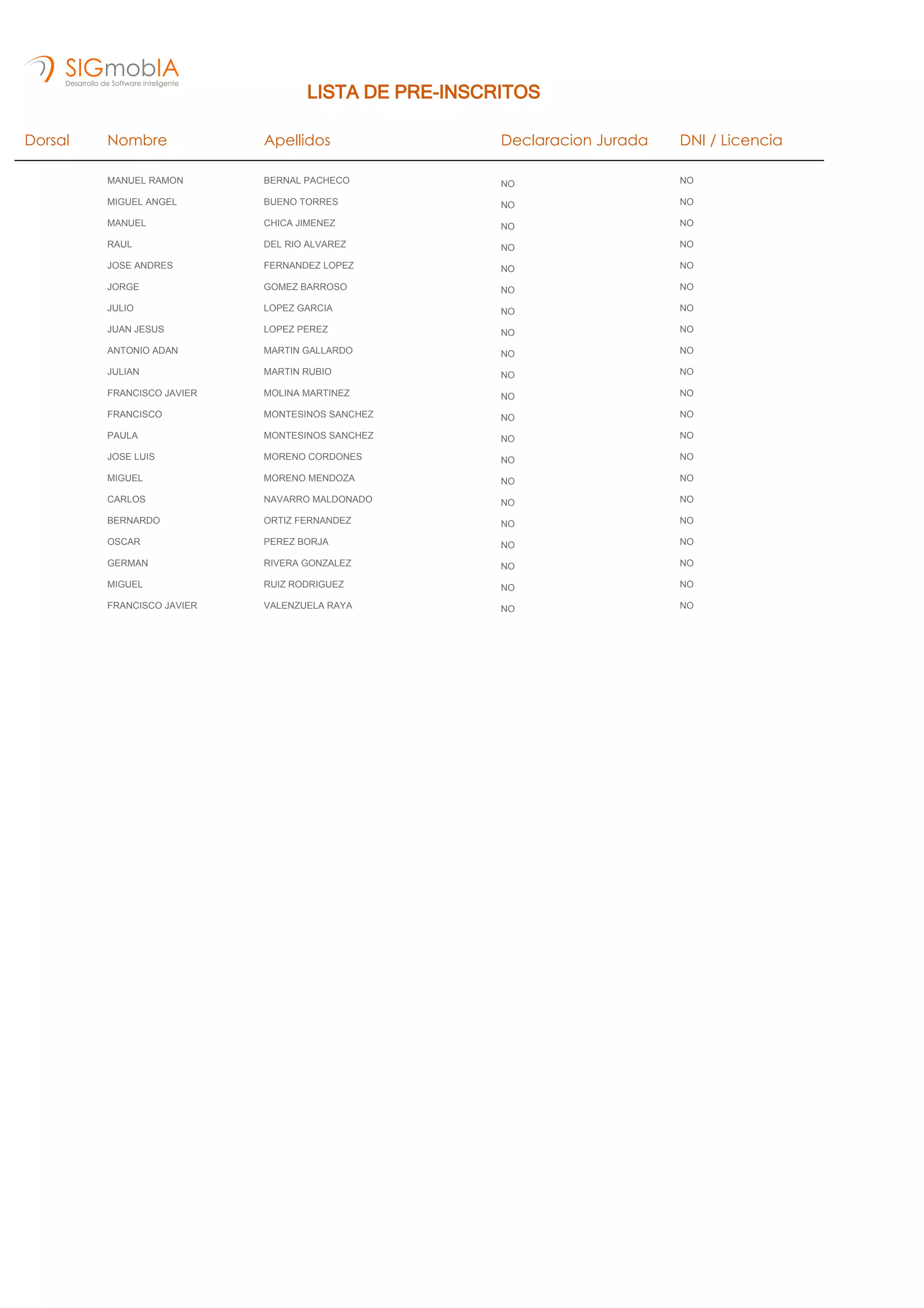 Dorsal Nombre Apellidos Declaracion Jurada DNI / Licencia
