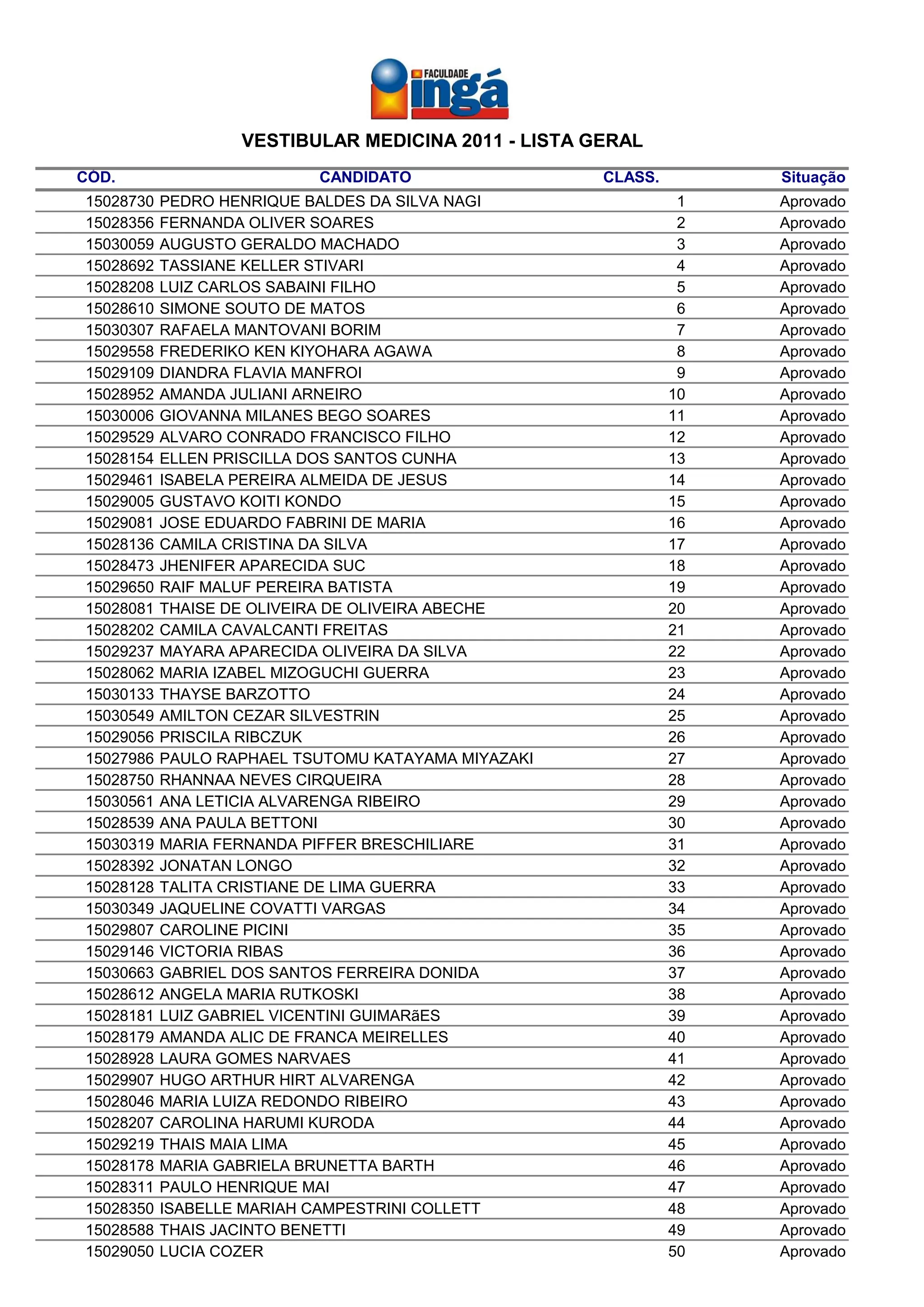 Este documento presenta una lista de 167 candidatos que hicieron el examen de ingreso a la carrera de medicina en 2011 en Brasil. Los candidatos están ordenados por su clasificación, con el primer candidato en el primer lugar. De los 167 candidatos, 96 fueron aprobados directamente y 71 quedaron en lista de espera.