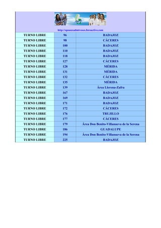 Este documento lista los turnos de plazas disponibles para agentes de policía en Extremadura, España. Incluye turnos de promoción interna, discapacidad y libres. La mayoría de las plazas disponibles se encuentran en las ciudades de Badajoz, Cáceres, Mérida y Don Benito así como en las áreas de Don Benito-Villanueva de la Serena y Llerena-Zafra. Se ofrecen un total de 225 plazas en diferentes localizaciones de la región de Extremadura.